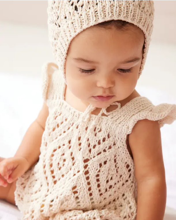 Pletené body na teplé letné dni je to pravé! Body na ramienka ozdobené malými volánikmi je upletené krásnym ažúrovým vzorom. Veľkou výhodou je zapínanie na patentky v rozkroku, ktoré vám uľahčí prebaľovanie. Na pletenie odporúčame použiť mäkkú prírodnú priadzu s bavlnou a viskózou Phil RUSTIQUE. Pokračovať
