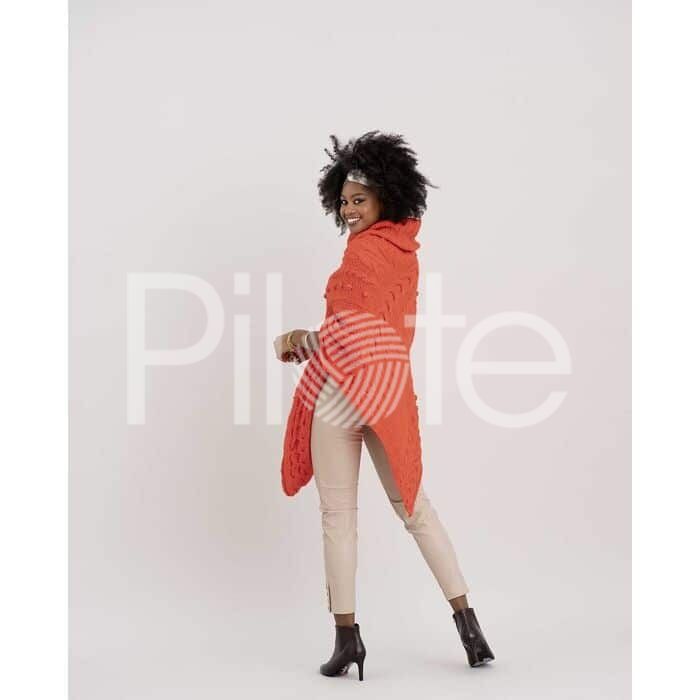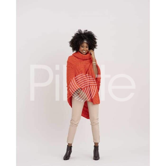 Pončo je upletené z vlny Phil Nuage vo farbe Vermillon.