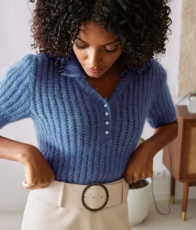 Trend polo golierov stále stúpa. Upleťte si sveter s krátkym rukávom, polo golierom a efektným vzorom. Na pletenie použite mäkkú, jemne lesklú priadzu s hodvábom a mohérom Pokračovať
