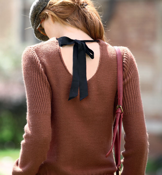 Hladko, obrátene, nahodiť , ... a výsledok? Nadčasový, elegantný ženský pulóver. Model má zúžený pás a jemný vzor, ktorý opticky zoštíhľuje postavu. Čerešničkou na torte je zaväzovanie saténovou stuhou na zadnom diely. Na pletenie budete potrebovať mäkkú priadzu Pokračovať