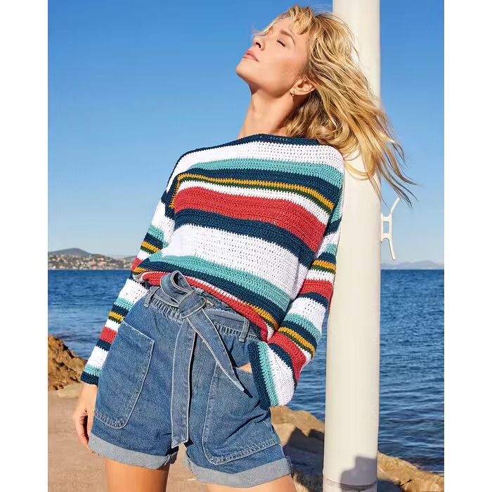 Slnko, more, ľahký vánok.... V tomto páskovanom pulóvri v krásnych, letných farbách sa budete stále cítiť ako na dovolenke. Model s lodičkovým výstrihom a dlhými rukávmi zvládnu podľa nášho návodu uháčkovať aj začiatočníci. Umocnite letného ducha pulóvra a na háčkovanie použite 100% prírodnú priadzu s jemnou viskózou a chladivým ľanom Phil RUSTIQUE. Pokračovať