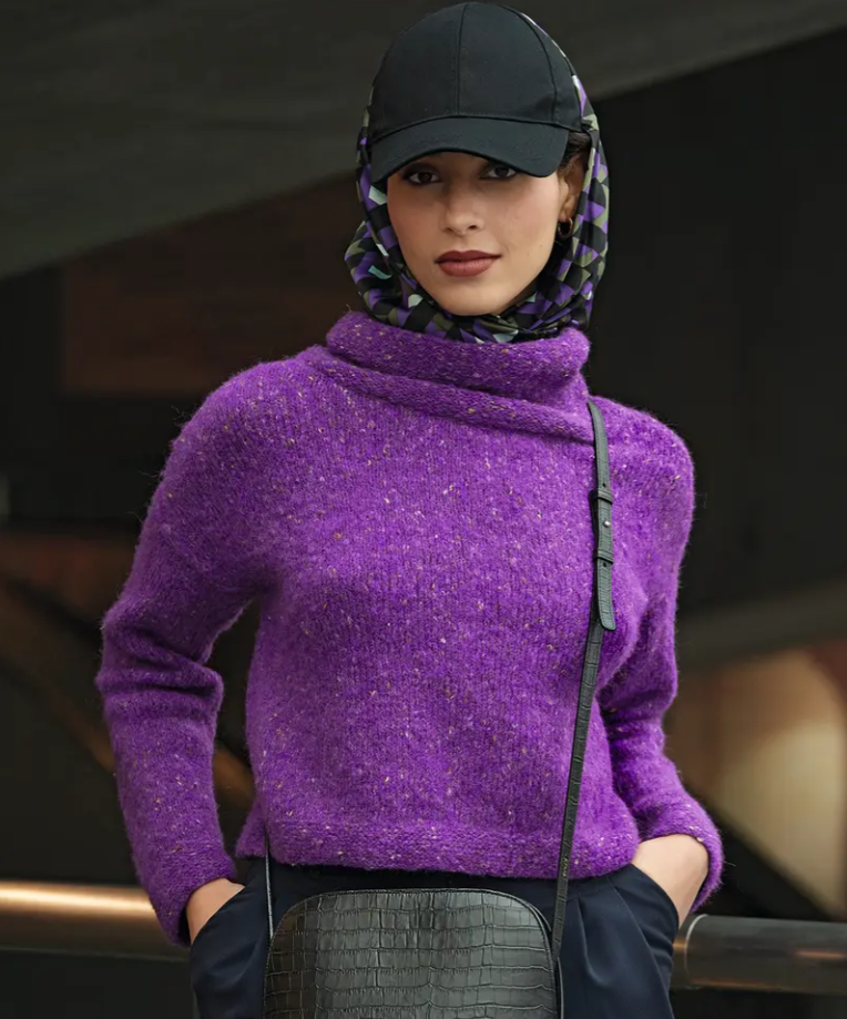 Farebná terapia. Dámsky rolák so silou fialovej farby! Na tento model pletený do kruhu použite efektnú priadzu s alpakou PHIL COZY, farbu ULTRAVIOLET. Vedeli ste? Fialová farba vyžaruje pokoj, duševne upokojuje, zmierňuje stres a bolesti hlavy. Pokračovať