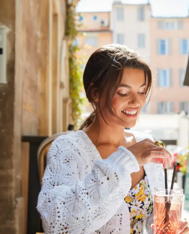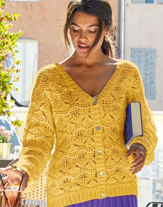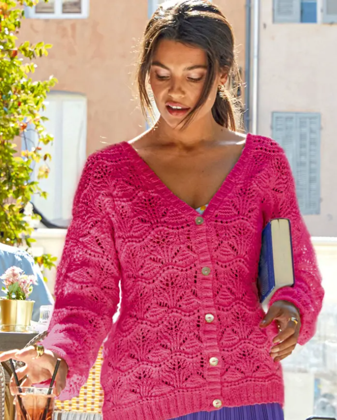 Dámsky sveter s v-výstrihom a krásnym ažúrovým vzorom. Aj keď má dlhý rukáv, je to ľahučký sveter na chladnejšie rána alebo večery. Je upletený z veľmi jemnej čistej bavlny Pokračovať