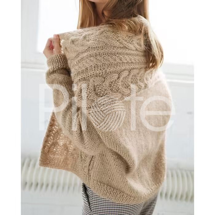 Elegantný dámsky sveter bez gombíkov s plastickým vzorom. Model je upletený z dvoch materiálov -z lesklej priadze Phil Brillant ku ktorej je pridaná tenká mohérová vlna. Z našej ponuky odporúčame Pokračovať