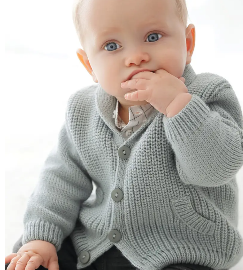 Detský svetrík so zapínaním, presne taký, ako nosí tatino! Kardigán so šálovým límcom, falošnými vreckami a plastickým vzorom. Model upleťte z jemnej detskej priadze Pokračovať
