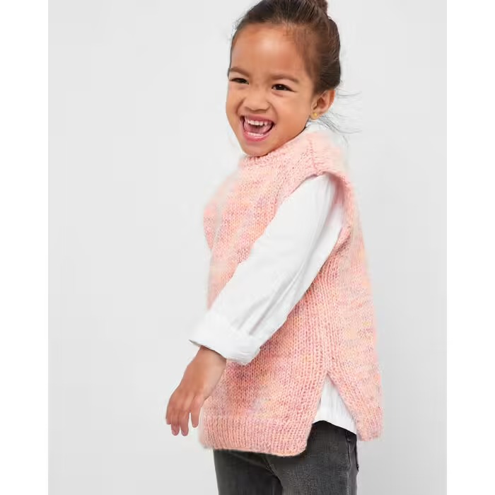 Štýlová vesta ako pre dospelých! Skombinujte 2 ultra jemné priadze v dievčenských farbách a lícovým jersoyom upleťte ľahučkú vestu pre malé parádnice. Pokračovať