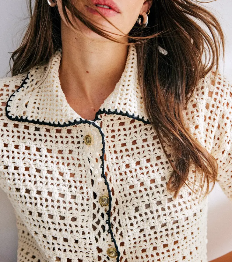 Háčkovaná košeľa, váš nový spoločník na leto. Elegantná, vzdušná košeľa s čiernym lemom a zlatými gombíkmi. Na vytvorenie modelu budete potrebovať letnú priadzu Phil Cabotine 3, háčik číslo 3, značkovače očiek, ihlu na vlnu a 5 zlatých gombíkov s uškom. Pokračovať