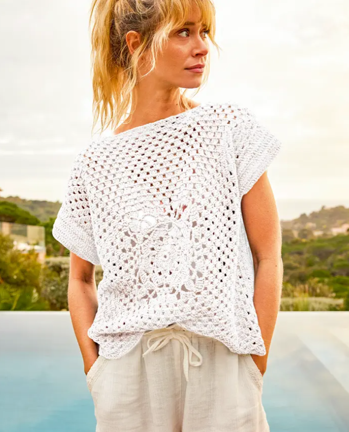 Háčkovaný letný pulóver s krátkym rukávkom a lodičkovým výstrihom, ktorého základom je babičkin štvorec. Užite si hru svetla a tieňa na pokožke. Model uháčkujte zo 100% prírodnej priadze s chladivým ľanom a jemnou viskózou Pokračovať