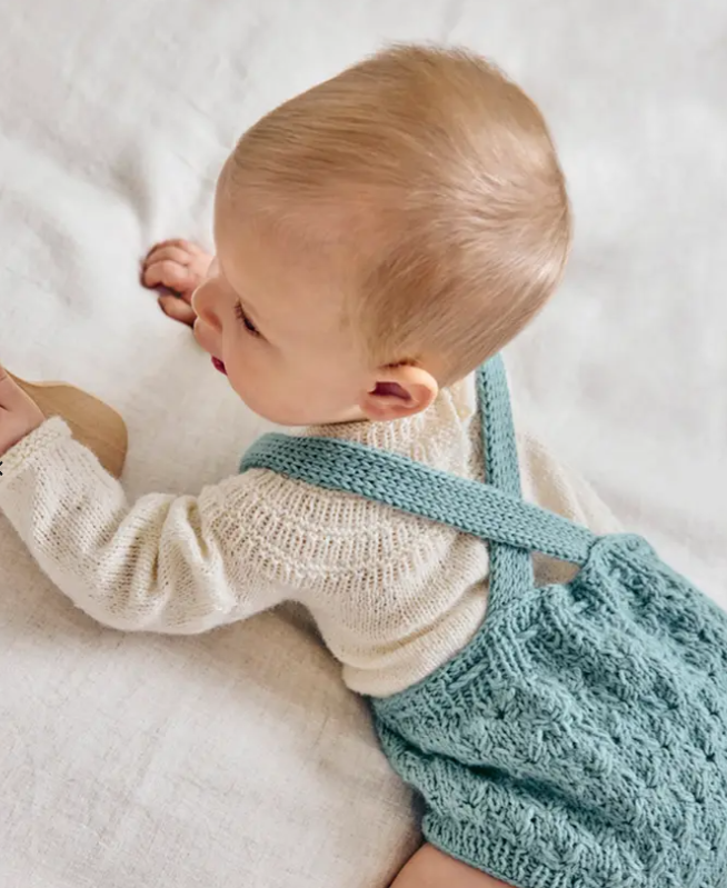 Kto by nesníval o krásnych pletených nohaviciach pre svoje bábätko? Krátke nohavice s trakmi a šnúrkou v páse - model v ktorom bude vaše bábätko také rozkošné. Jemný vzor vytvára pletený anglický vyšívací steh. Na pletenie použite mäkučkú detskú priadzu Phil CARESSE, farbu Amande a ihlice číslo 3 a číslo 3,5. Pokračovať
