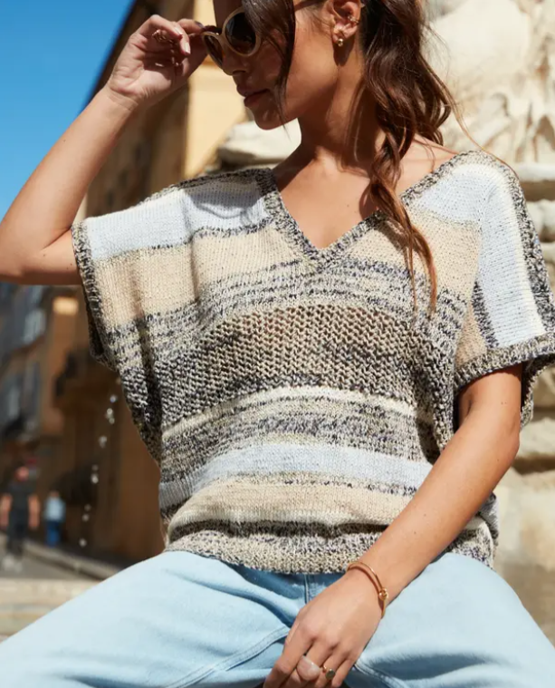 Túžite po pulóvri v prírodných farbách? Na tomto modeli páskovaného pulóvra s výstrihom na prednom aj zadnom diely sa v efektných pásoch striedajú žiarivé farby a minerálne tóny. Pokračovať