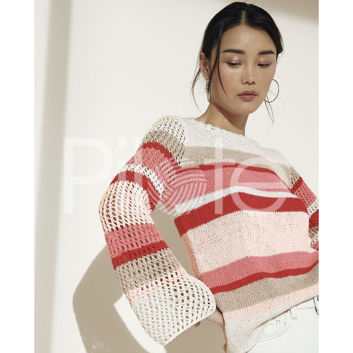 Transparentný, jemný, ľahký, .... letný pruhovaný pulóver s pagodovými rukávmi z mäkkej a autentickej priadze s ľanom, bavlnou a viskózou PHIL ROUSTIQUE. Na vytvorenie tohto modelu budete potrebovať: ihlice číslo 3,5 a číslo 4. Návod pre veľkosti: 34/36, 38/40, 42/44, 46/48, 50/52. Úroveň pletenia: pokročilí