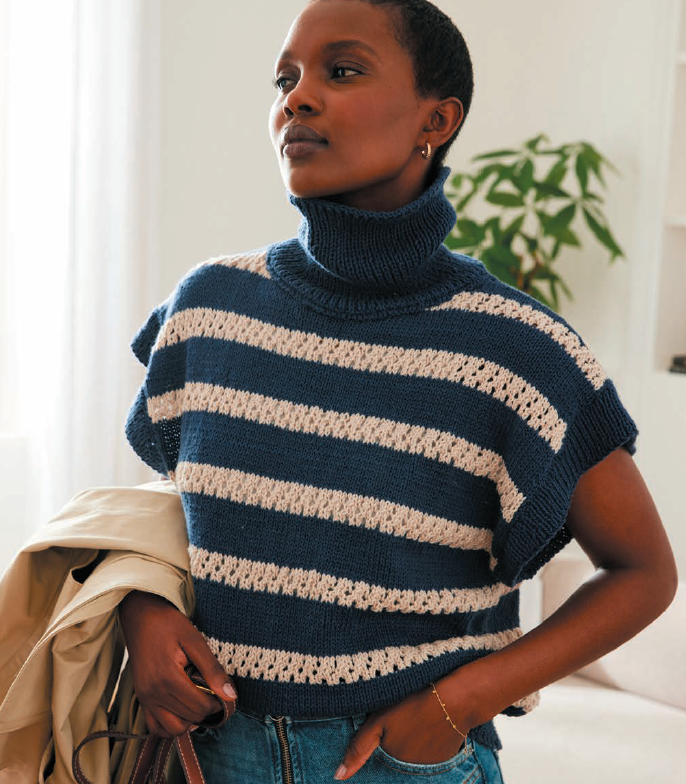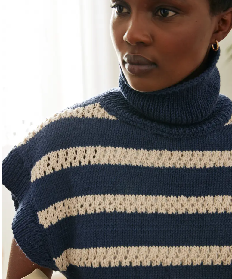 Nadčasový námornícky štýl! Obnovte svoj šatník. Upleťte si páskovaný pulóver so spadnutými rukávmi a vysokým rolákom z veľmi mäkkej, čistej bavlny PHIL LOVE COTTON, vo farbách MARINE a LIN. Pokračovať