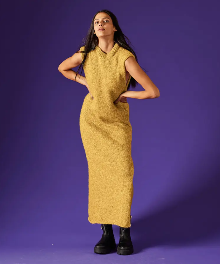Chcete byť chic a cool? Dlhé šaty bez rukávov s vysokým rozparkom na boku v sebe spájajú obidva štýly. Jednoduchý, efektný model je pletený lícovým žerzejom z jemne lesklej priadze Pingo SALSA vo farbe Doré na ihliciach číslo 5 a číslo 6. Pokračovať