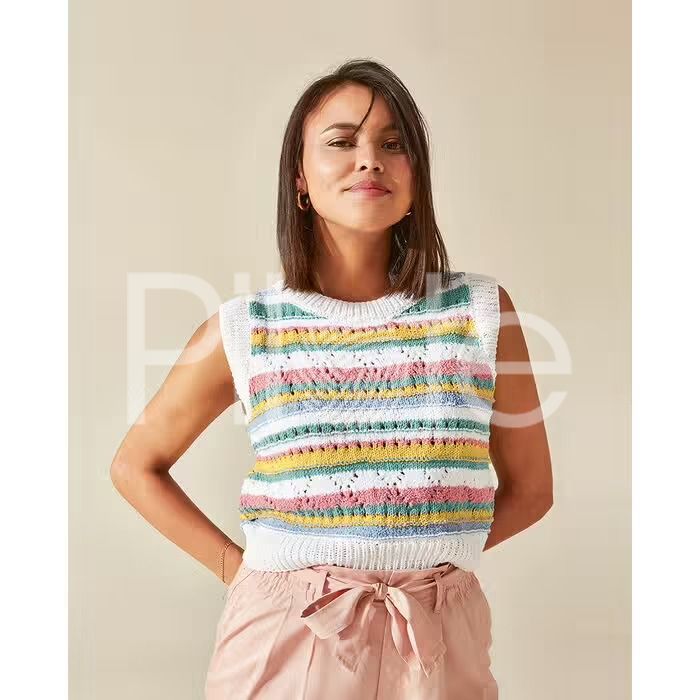 Jemnosť, pastelové farby, fantázia... Poetická hra prúžkov a ažúrového vzoru vytvorili toto letné tielko. Použité sú bavlnené priadze PHIL CABOTINE, PHIL BABY DOLL, PHIL RUSTQUE a ECOTON. Na vytvorenie tohto modelu budete potrebovať: ihlice číslo 3 a číslo 3,5. Návod na pletenie v nasledujúcich veľkostiach: 34/36, 38/40, 42/44, 46/48, 50/52. Úroveň pletenia: pokročilí
