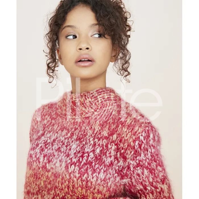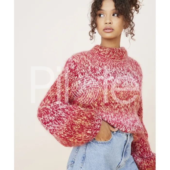 Kratší pulóver s balónovými rukávmi. Model je pletený dvojmo, z dvoch melírovaných priadzí. Návod pre veľkosti 34 - 52. Úroveň pletenia: mierne pokročilý