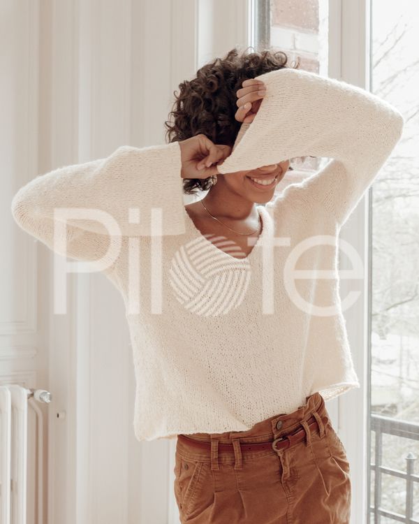 Dámsky pulóver lichobežníkového tvaru s pagodovými rukávmi. Model má v-výstrih na prednom aj zadnom diely a zaoblené spodné okraje. Pokračovať
