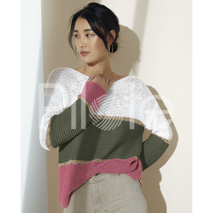 Dámsky letný pulóver zo 100% prírodnej priadze Phil EUCALYPTUS. Farebné bloky sú oddelené lesklou priadzou Phil SIRENE. Návod pre veľkosti: 34 až 52. Úroveň pletenia: mierne pokročilí