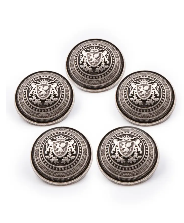 Sada 5 gombíkov s uškom, v dôstojníckom štýle. Imitácia starého striebra. Dostupné v 2 veľkostiach 15 mm a 20 mm. Pokračovať