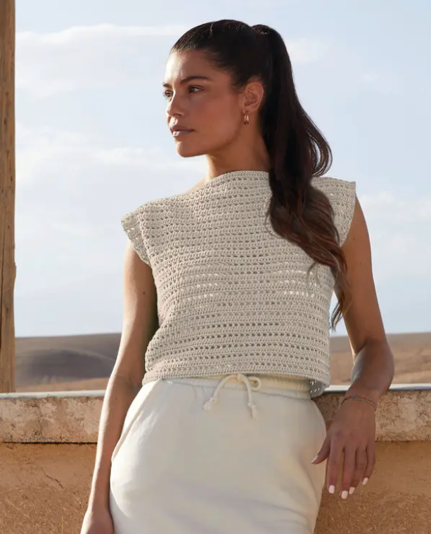 Radosť z vlastnej kreativity! Pri háčkovaní aj nosení tohto topu z čistej organickej bavlny ju určite pocítite. Jednoduchý strih + jednoduchý vzor = letná elegancia. Pokračovať